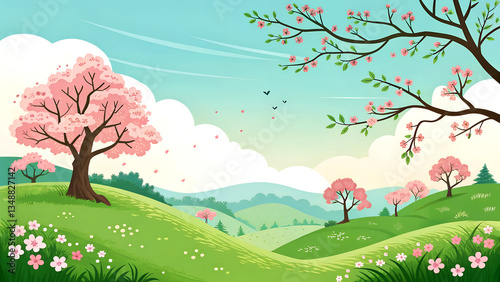 Illustrated spring scene with green hills, pink blooming trees and blue sky. Perfect for seasonal backgrounds, nature themes, and greeting cards.