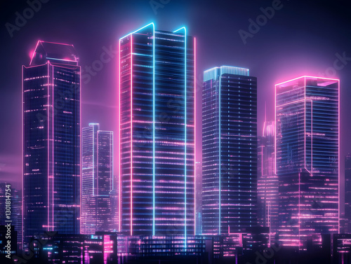 Illustration - Neon Cityscape, Futuristic Architecture, Night, Urban, Glowing Lines, Modern, 3D Rendering, Digital Art, Cyberpunk