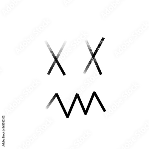 Illustration depicting a face, instead of eyes, crosses instead of lips, a zigzag, an abstract drawing, in black chalk on a white background