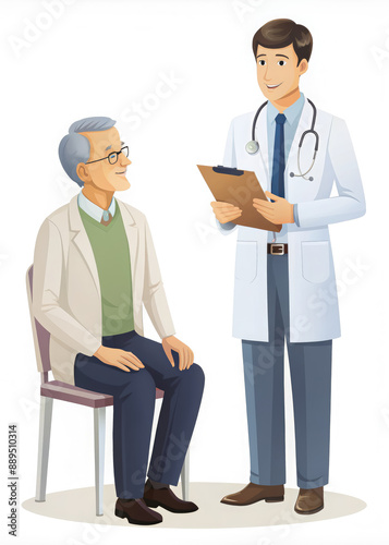 illustration doctor talking to a patient on a white background, drawing, cartoon style, medicine, hospital, clinic, science, treatment, disease, examination, therapist, stethoscope, white coat, people