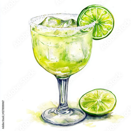 illustration, lime, drink, refreshing, watercolor, design, painted, realistic, style, water, glasses, cocktail, margarita, ice, alcohol, beverage, citrous, fruit, summer, tropical, fresh, green, cold, cool, liquid, thirst, quencher, isolated, white, background, clip, art, graphic, artwork, drawing, hand-made, artistic, food, sweet, sour, ingredient, garnish, decoration, sliced, juicy, party, refreshment, quenching