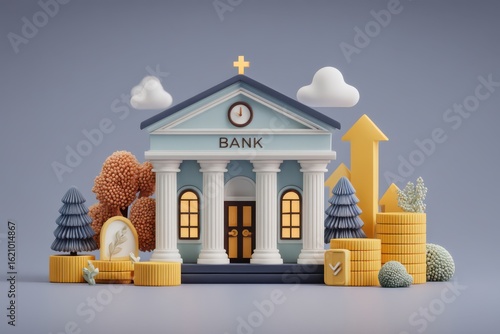 Illustration of a bank building with coins, arrow graph, and businessman