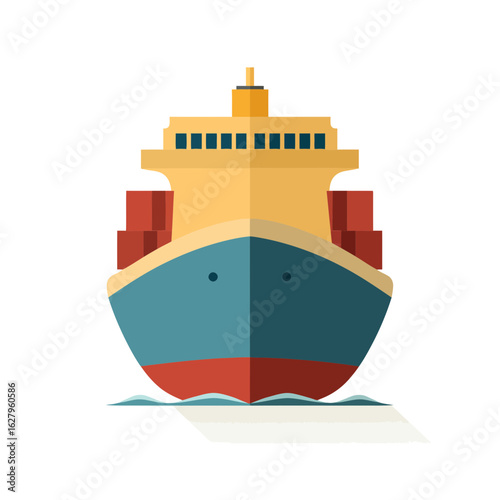 Illustration of a cargo ship loaded with containers viewed from the front on a plain background, concept for global trade, maritime transport and export logistics.