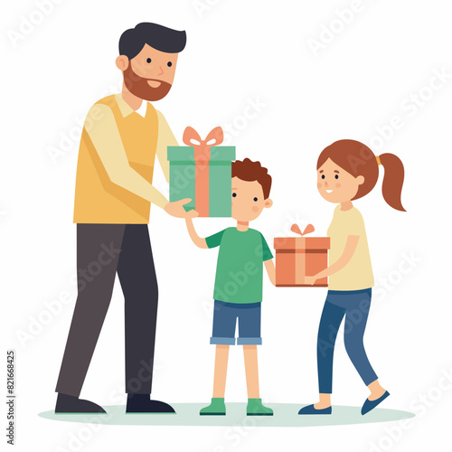 Illustration of a daughter and son surprising a father and giving a gift to their father