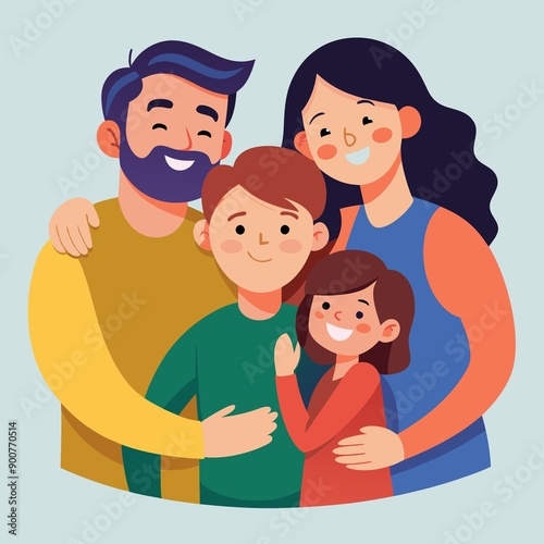 happy family, illustration, two children, smiling, hugging, togetherness, love, connection, cartoon, digital artwork, colourful, playful, fun, mother, father, son, daughter, happiness, parenting, family time, joy, affection, oneness, human relationships, caring, family portrait, drawing, bright, positive, soulful, parenthood, group, friendly, harmonious, cute, modern, support, warmth, cosy, artistic