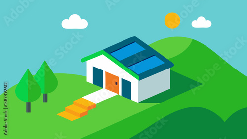 house, home, vector, illustration, building, landscape, sky, architecture, estate, nature, grass, cartoon, tree, bungalow, summer, village, real, design, roof, door, residential, construction, garden, window, meadow