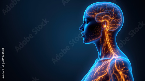 Illustration of a human head with highlighted brain and nervous system, showing the concept of VNS (Vagus Nerve Stimulation).