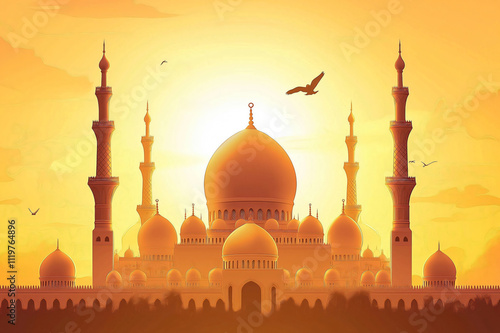 Illustration of a majestic grand mosque with intricate architecture, bathed in the warm glow of a setting sun, as birds fly gracefully in the sky
