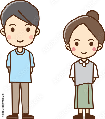 woman, man, sister, couple, young, japanese, family, casual, uprise, stand, front, stood, two people, couple, people, friends, partner, communication, smile, fellow, lover, pose, pair, expression, set, calm, relax, waiting, observe, attitude, teamwork, affinity, room, dialogue, background, father, mother, illustration, vector