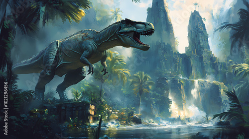 illustration, prehistoric, jungle, dinosaur, ancient, ruin, primal, tribe, uncover, secret, lost, earth, glacé, time, alien