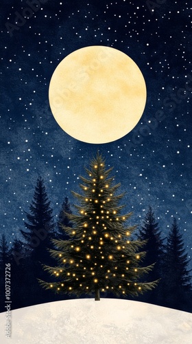 Illustration of a snowcovered forest with a glowing Christmas tree in the center surrounded by twinkling stars and a full moon Perfect for holiday cards and festive winter greetings with a magical and