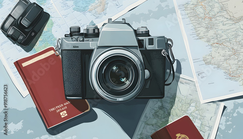 Illustration of a top view of a travel photography setup with a camera, maps, and a passport, arranged in a flat lay with ample copy space