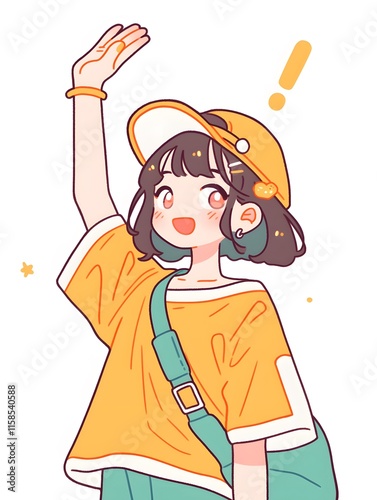 Illustration of a woman waving her hand and greeting you brightly, Generative AI