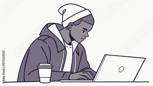 man, laptop, hot drink, vector, illustration, graphic, art, design, young, person, technology, computer, drink, cup, hoodie, beanie, workspace, desk, typing, student, freelancer, work, study, online, digital, modern, casual attire, indoor, minimalist, outline, cartoon, style, isolated, creative, drawing
