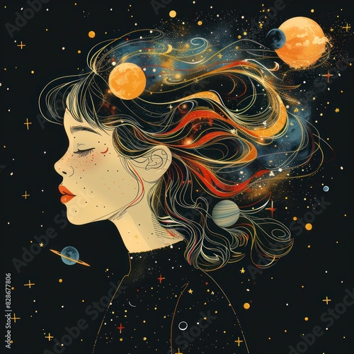 colourful, dream, extension, fantasy, galaxy, human, planet, profile, star, universe, star, background, magic, rainbow, artistic, graphic, glamour, feminine, person, artwork, haircut, sleep, lady, night, shampoo, face, explore, female, care, portrait, hair, relax, light, long, art, space, woman, abstract, girl, vibrant, calm, character, concept, sky, fashion, style, flat