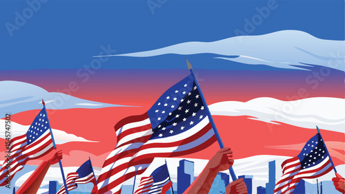 Illustration of american flags waving against a city skyline and patriotic sky background design