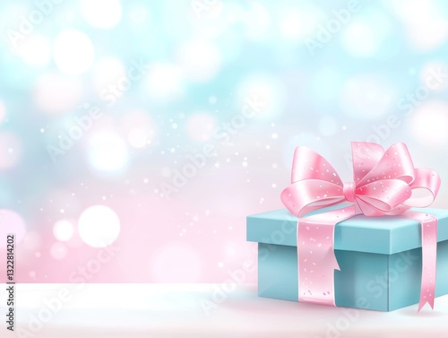 illustration of bright blue and pink colored cardboard box with pink bow and ribbons placed on white table against blurred shiny background - ai