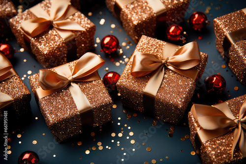 Illustration of festive gift boxes decorated with multicolored silk ribbons, surrounded by stylish Christmas decorations, stars, snowflakes on a soft background. Generative AI