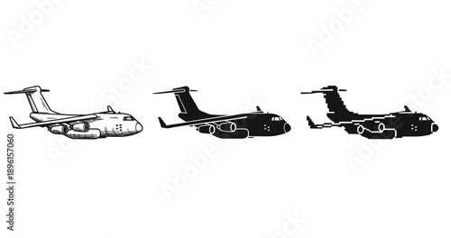 Illustration of military cargo aircraft in three styles: line art, silhouette, pixel