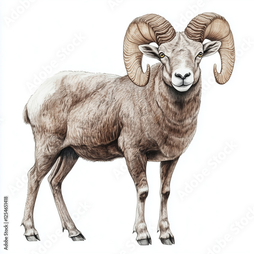 Illustration of the Bighorn Sheep, soft watercolor tones, white background, detailed illustration, cartoonish.