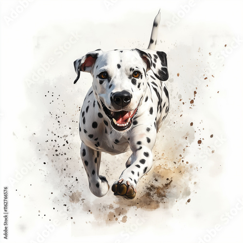 Illustration of the Dalmatian dog running towards, soft watercolor tones, white background, detailed illustration, cartoonish.
