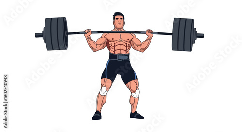 Illustrative depiction of a muscular man weightlifting with a barbell on a white background for strength training demonstration