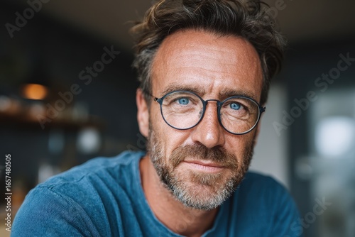 Image of a attractive 50 year old man wearing glasses and a blue t shirt indoors and with unshaven hair