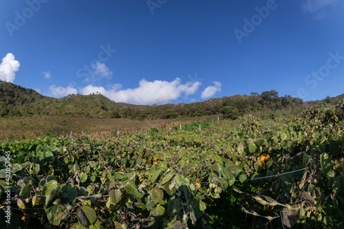 Image of a granadilla crop, with many ripe fruits in the Colombian Andes, in the Valle del Cauca Colombia.