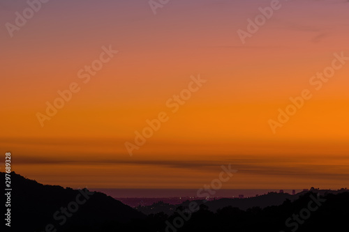 Image of a smoke-polluted dusk sky, following a wildfire, in Los Angeles looking west.