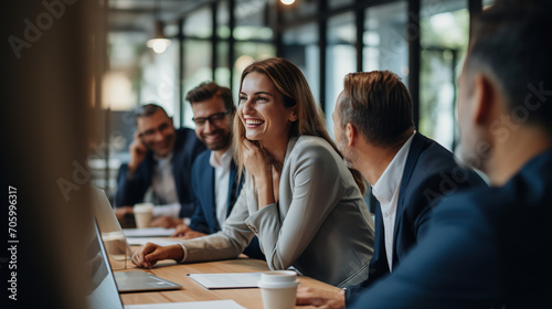 Image of a young professional woman with gray suit and blonde hair, being the center of attention at a business meeting