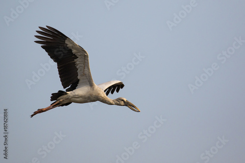 Image of an Asian openbill stork(Anastomus oscitans) flying in the sky. Bird, Wild Animals.