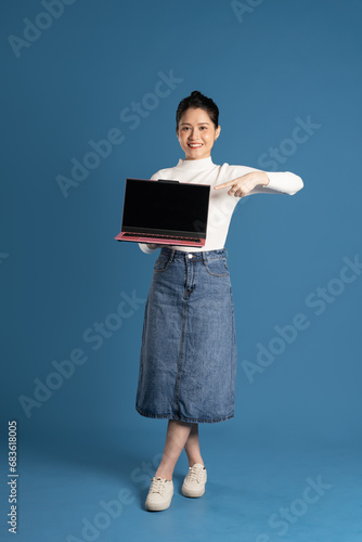 laptop, business, computer, work, technology, screen, blank, copy space, app, advertising, showing, pointing, gesture, advertisement, beautiful, full-length, full body, adult, asian, blue, businesswoman, chinese, female, happy, indonesian, isolated, japanese, korean, malaysian, people, portrait, smile, studio, thai, vietnamese, woman, young