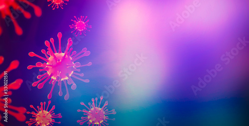 Image of Flu COVID-19 virus cell under the microscope on the blood.Coronavirus Covid-19 outbreak influenza background.Pandemic medical health risk concept with disease cell as a 3D render.illustration