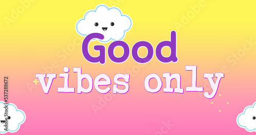 Image of good vibes only over happy clouds and yellow and pink background