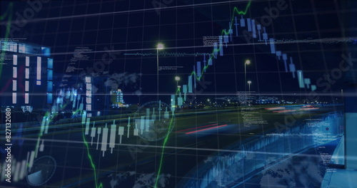 Image of graphs, soundwaves, computer language over time-lapse of cars moving on bridge in city