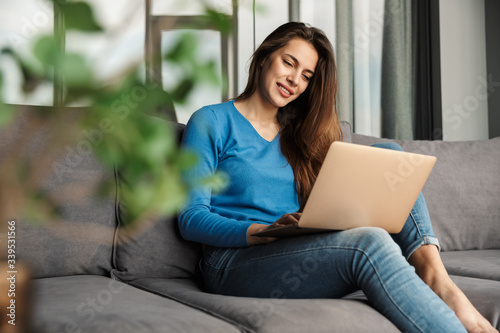 Image of happy woman using laptop and smiling while sitting on sofa