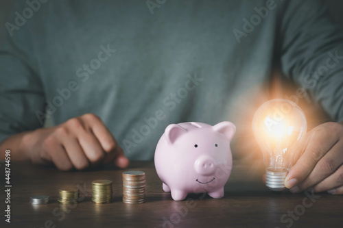 image of man hand holding light bulb with pink piggy bank for account save money. Planning step up, saving money for future plan, retirement fund. Business investment-finance accounting concept.