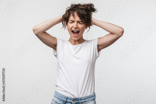 Image of shocked woman with short hair in basic t-shirt screaming and grabbing her head