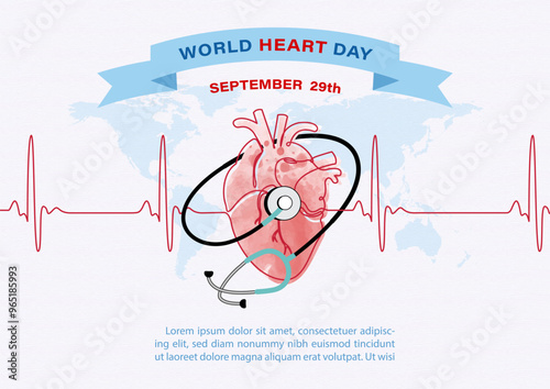 Image of Stethoscope around on a human heart with heartbeat and wording of World Heart Day, example texts on blue paper pattern background. Poster's campaign in watercolors and vector design.