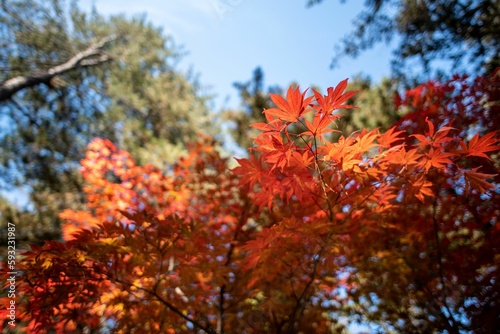 Image of trees with red leaves under the blue sky during the fall season.