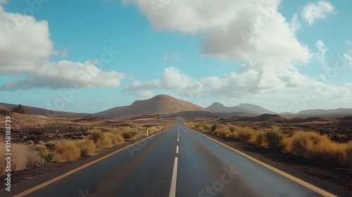Image related to unexplored road journeys and adventures.Road through the scenic landscape to the destination in Lanzarote natural park.