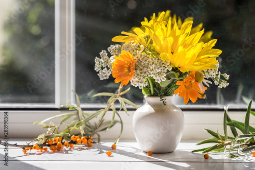 vase, chamomile, house, window sill, flower, sunshine, white, spring, water, sunflower, decorative, day, yellow, life, green, beautiful, beauty, kitchen, summer, ray, bright, nirvana, calm down, glasses, heat, decoration, morning, background, bloom
