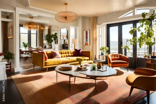 Immerse yourself in the luxury premium living room with two yellow mustard armchairs and a golden brass table. Ai generated
