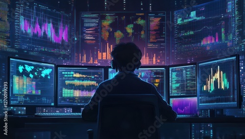 Immersed in data streams a lone figure amidst glowing screens analyzing complex information patterns