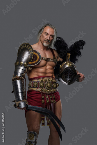 Imposing gladiator of mature age with a stylish silver beard and flowing grey hair dons lightweight armor, wielding a gladius and holds helmet as he stands proud against a neutral grey backdrop