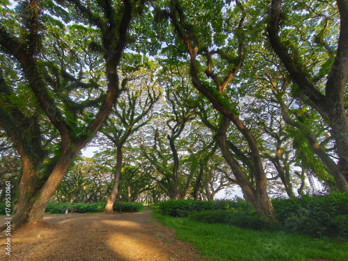 Imposing Trembesi tree canopy, a vibrant spectacle of green foliage and intertwining branches in the mystical De Djawatan woods.