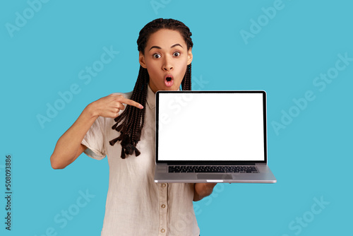 Impressed scared woman with dreadlocks opens mouth from interest and thrill, points at laptop with empty screen, feels fascinated, wearing white shirt. Indoor studio shot isolated on blue background.