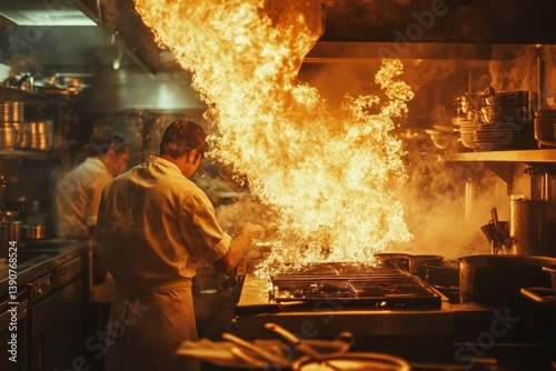 eatery, kitchen, chef, flames, cooking, dinner, service, fire, food, staff, stove, cookware, culinary, preparation, professional, tool, heat, intense, atmosphere, tied-up, environment, equipment, art, dish, meal, bustling, management, safety, creativity, industry, team, work, technique, magic, high, energy, dynamic, chaos, evening, rush, operation, effort, life, gastronomy, performance, aromatic, skill, generative, ai