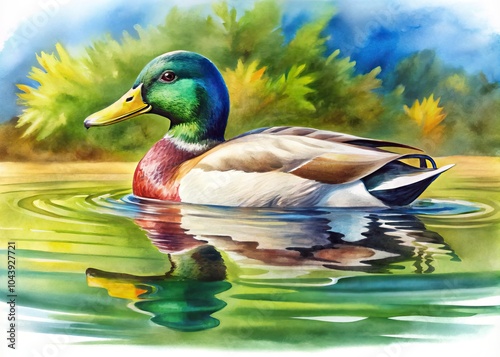 In a captivating watercolor scene, a duck swims elegantly through calm waters, its stunning reflection blending seamlessly with the gentle hues of nature.