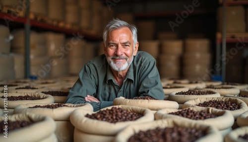 hot drink, warehouse, merchant, middle-aged, smile, sack, bean, authenticity, arrangement, symmetry, composition, depth, field, sharpened, foreground, background, scene, genuine, pose, bag, storage, aroma, texture, natural, light, atmosphere, industry, trade, rustic, warmth, workspace, environment, product, burlap, detail, shop, traditional, profession, setting, casual attire, senior, person, fresh, businessman, business, smiling, looking, expression